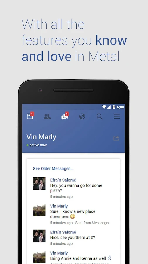 Access your messages, news feed and notifications from any app, with a tap and a swipe. Swipe down the notifications bar and tap an icon. Metal Everywhere opens, allowing you to browse in a floating window, while you wait for a game to load or a photo to download.